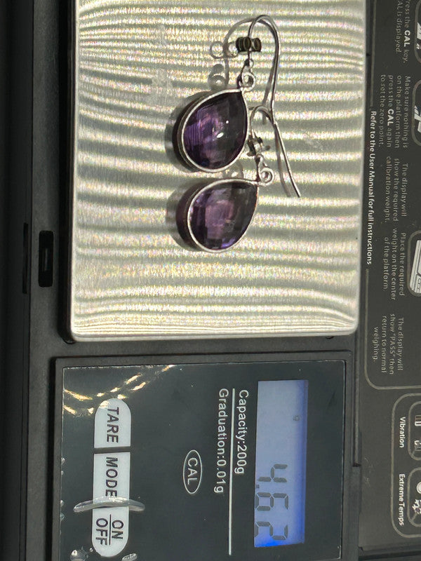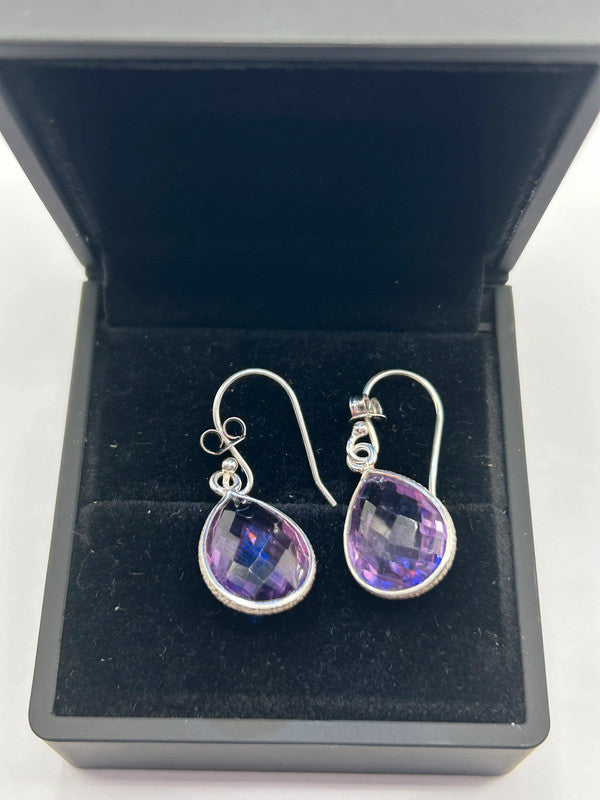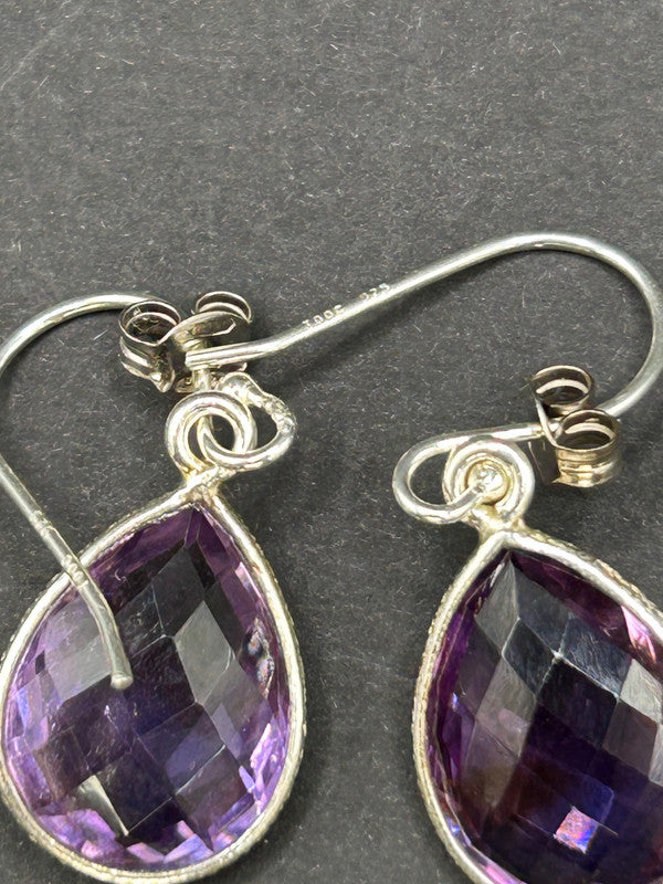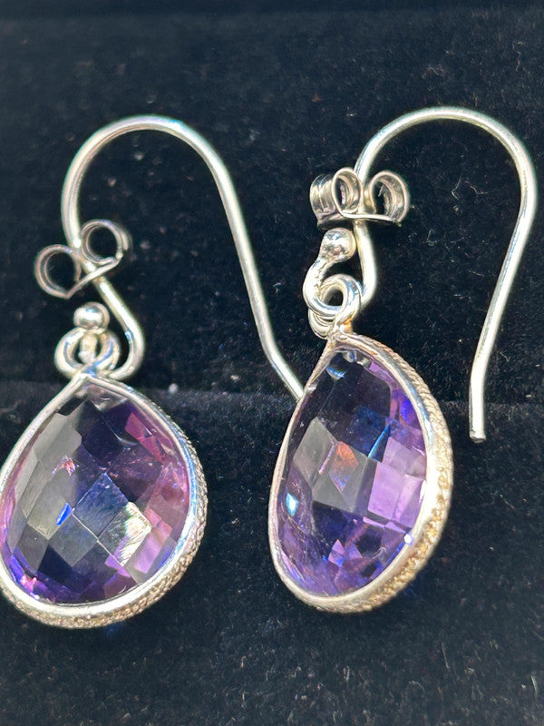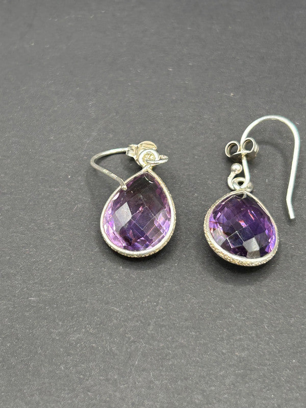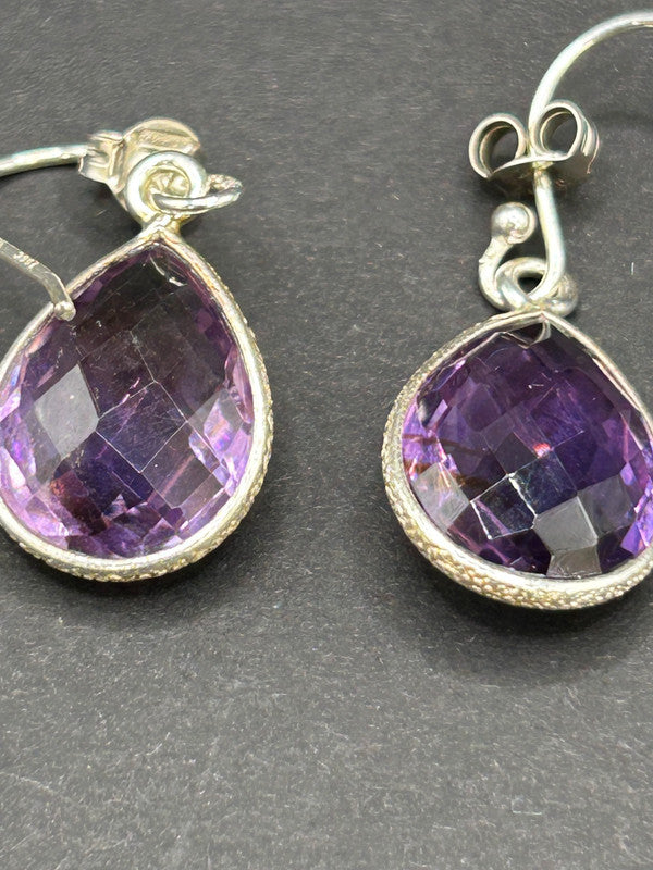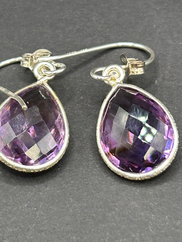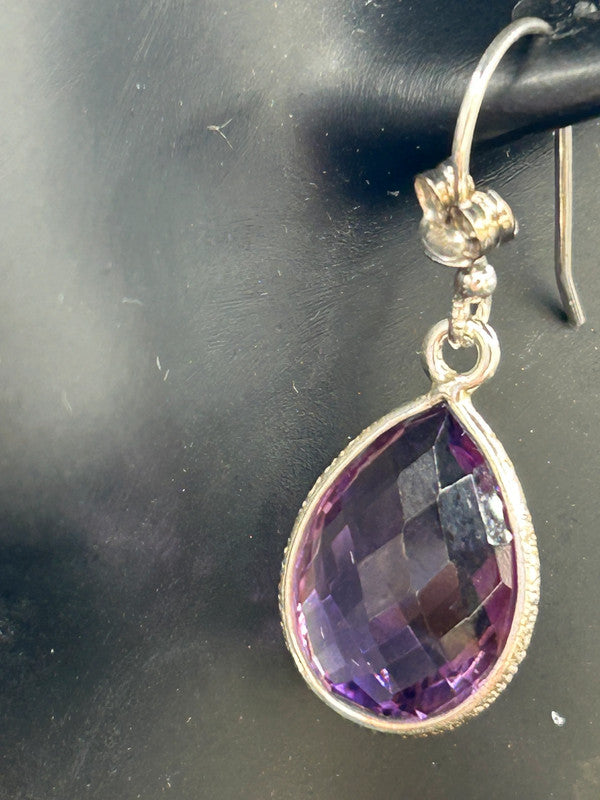 Make a truly captivating statement with these magnificent natural amethyst drop earrings, elegantly set in gleaming sterling silver! Boasting an impressive 16 carats total weight for the pair, these earrings come complete with their Certificate of Authenticity (COA), guaranteeing their genuine gemstones (ref 125). Each earring features a substantial, beautifully faceted teardrop-shaped amethyst gemstone, radiating rich, vibrant purple hues. The secure silver setting, possibly with intricate detailing, enhances their classic appeal. The large size and sparkling cut ensure they catch the light beautifully, making them a truly eye-catching pair. Amethyst is the enchanting birthstone for February, making these earrings a perfect gift, a luxurious treat for yourself, or a cherished addition to any fine jewellery collection. Metal: Sterling Silver 925 Gemstone: Natural Amethyst (faceted teardrop/pear cut) Carat Weight: 16ct Total Weight (TW) Weight: 4.62 grams (total for pair) Certification: Includes Certificate of Authenticity (COA) Style: Drop Earrings In excellent condition, a vibrant and authenticated treasure ready to make a grand statement!