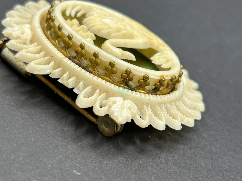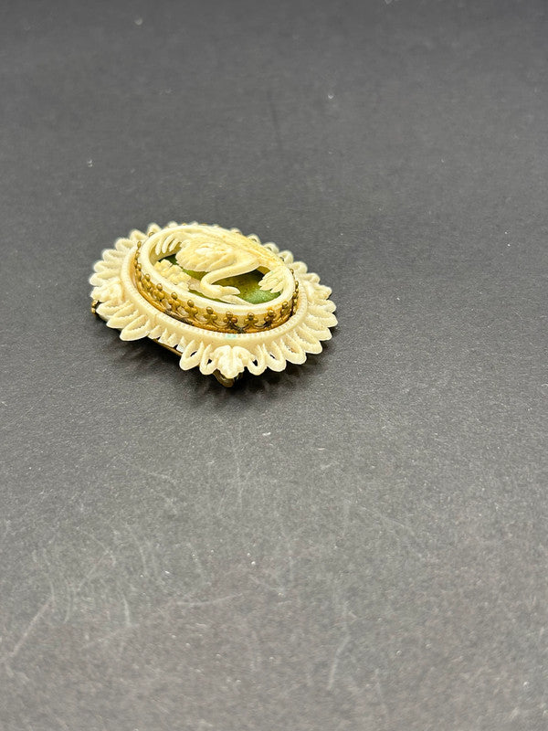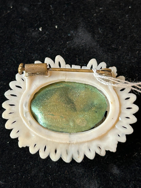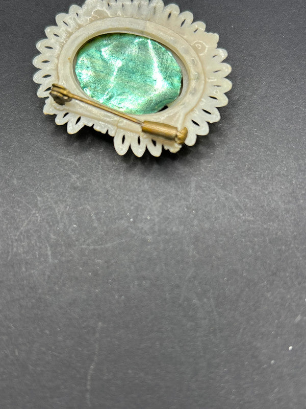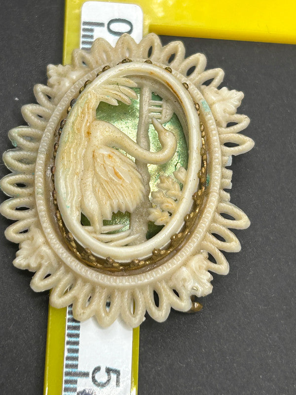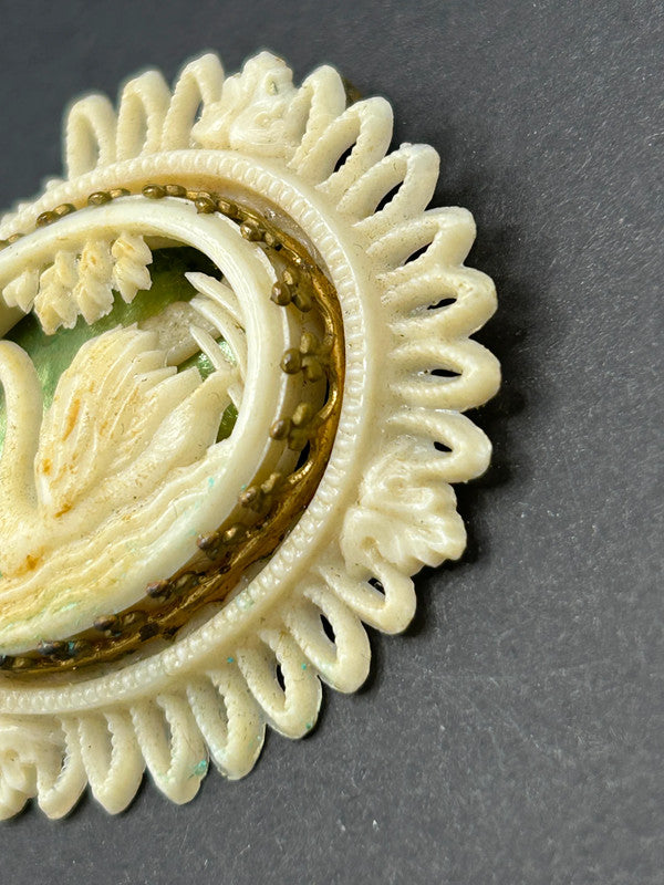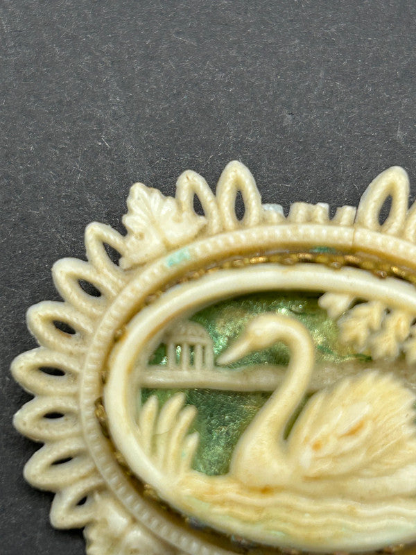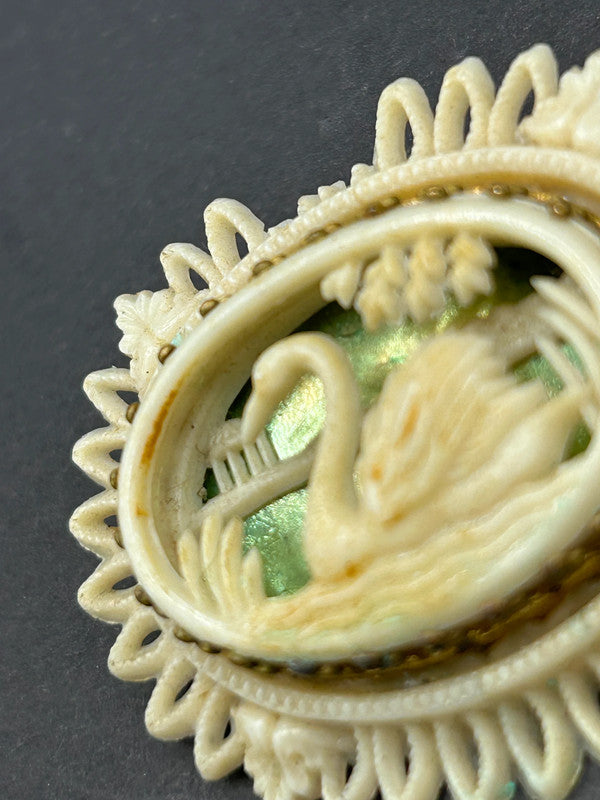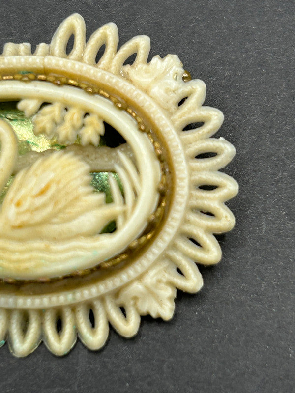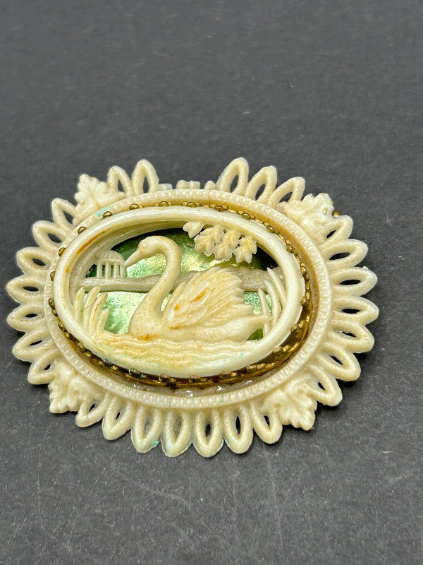 A beautiful vintage brooch featuring a graceful white swan gliding on a textured background with delicate details. The brooch has an ornate, scalloped border. The material is a lightweight, off-white vintage plastic or celluloid. It has some damage at the top seen in pictures. The foil also comes out and is not totally secure, so needs a little attention, but a beautiful brooch considering the age. The back features a classic pull-style clasp in a brassy colour. This piece has a lovely, timeless appeal and a collectible feel. Design: Elegant white swan on water. Material: Vintage celluloid or early plastic. Colour: Off-white with a darker background. Clasp: Vintage pull clasp in a brassy colour. Style: Vintage, elegant.