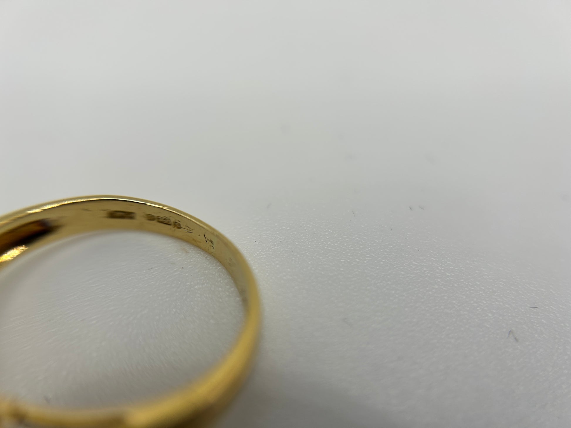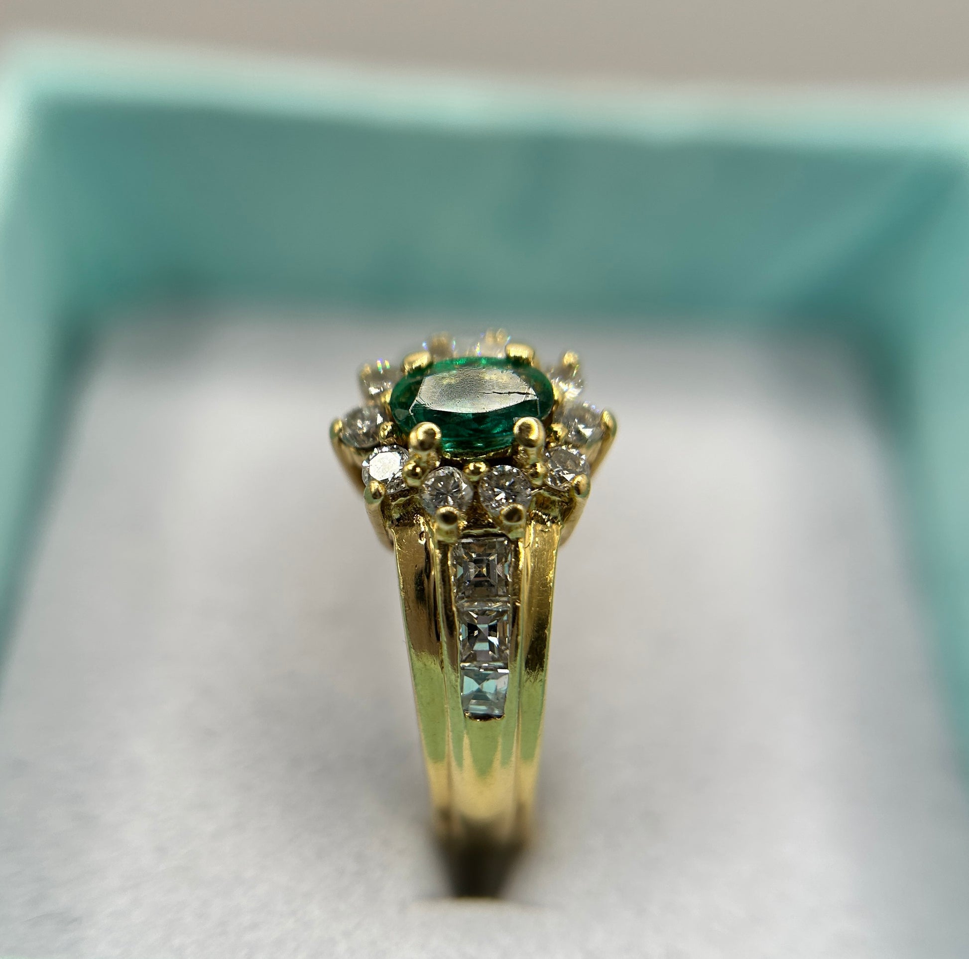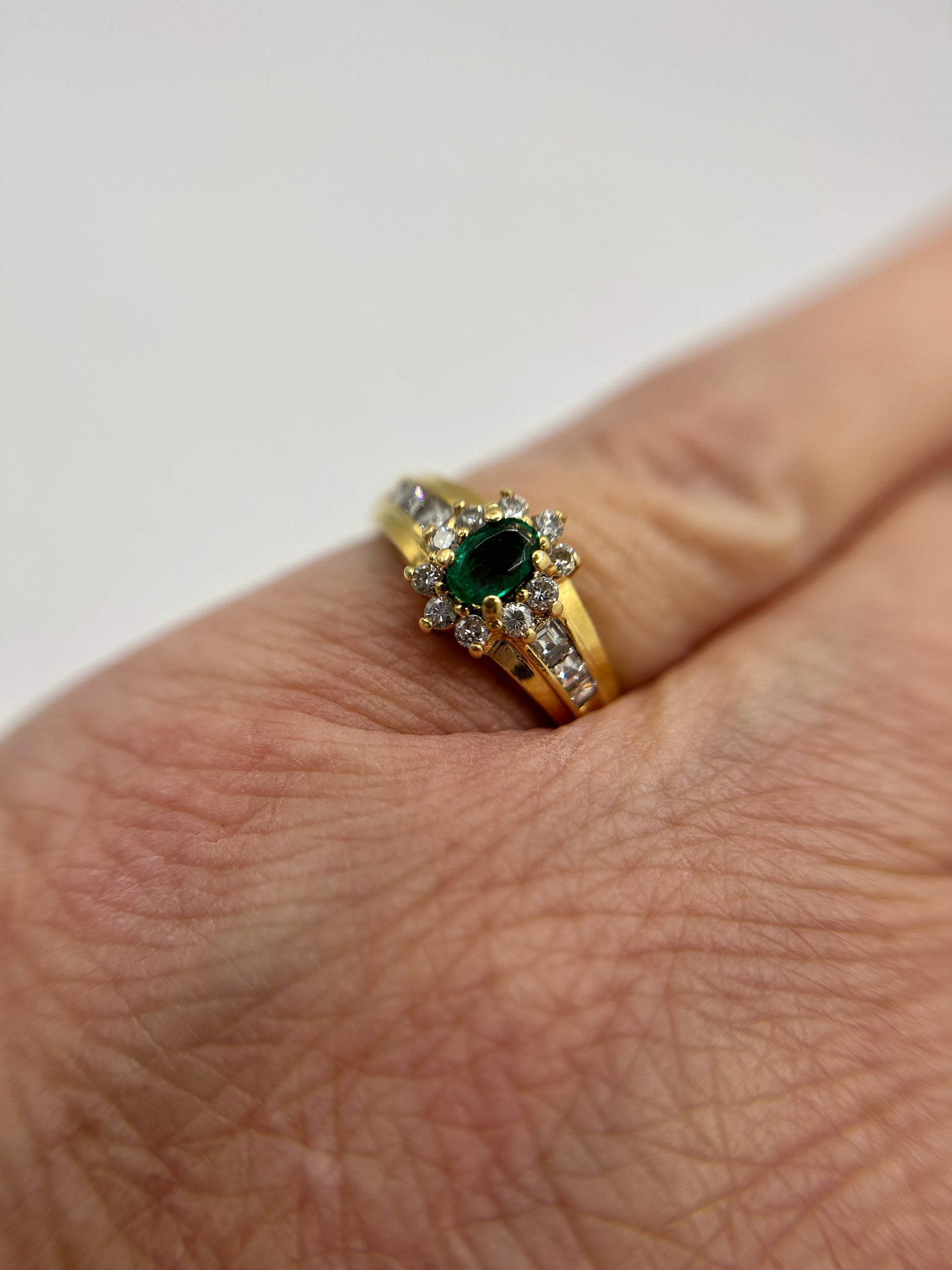Adorn your hand with this truly exquisite vintage ring, crafted in luxurious 18 carat yellow gold (hallmarked "750 P")! This captivating piece features a vibrant, oval-cut natural emerald at its heart, radiating a beautiful green hue. The emerald is elegantly framed by a dazzling halo of sparkling round brilliant-cut diamonds, with additional baguette-cut diamonds channel-set into the shoulders of the band, creating a magnificent display of brilliance (16 diamonds in total). Weighing a comfortable 3.15 grams, this ring has a lovely solid feel and a timeless design, perfect as a statement piece, a unique gift for a May birthday, or a cherished addition to any fine jewellery collection. Metal: 18ct Yellow Gold (hallmarked 750 P) Centre Stone: Natural Emerald (oval cut) Accent Stones: 16 Diamonds (round brilliant & baguette cuts) Weight: 3.15 grams Style: Cluster/Halo with Diamond Shoulders In excellent condition, a stunning treasure ready to be admired!