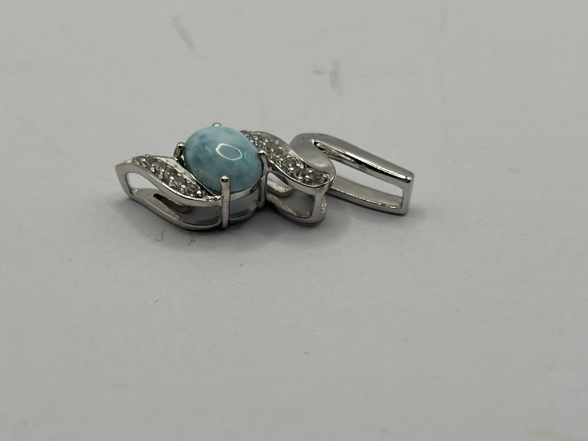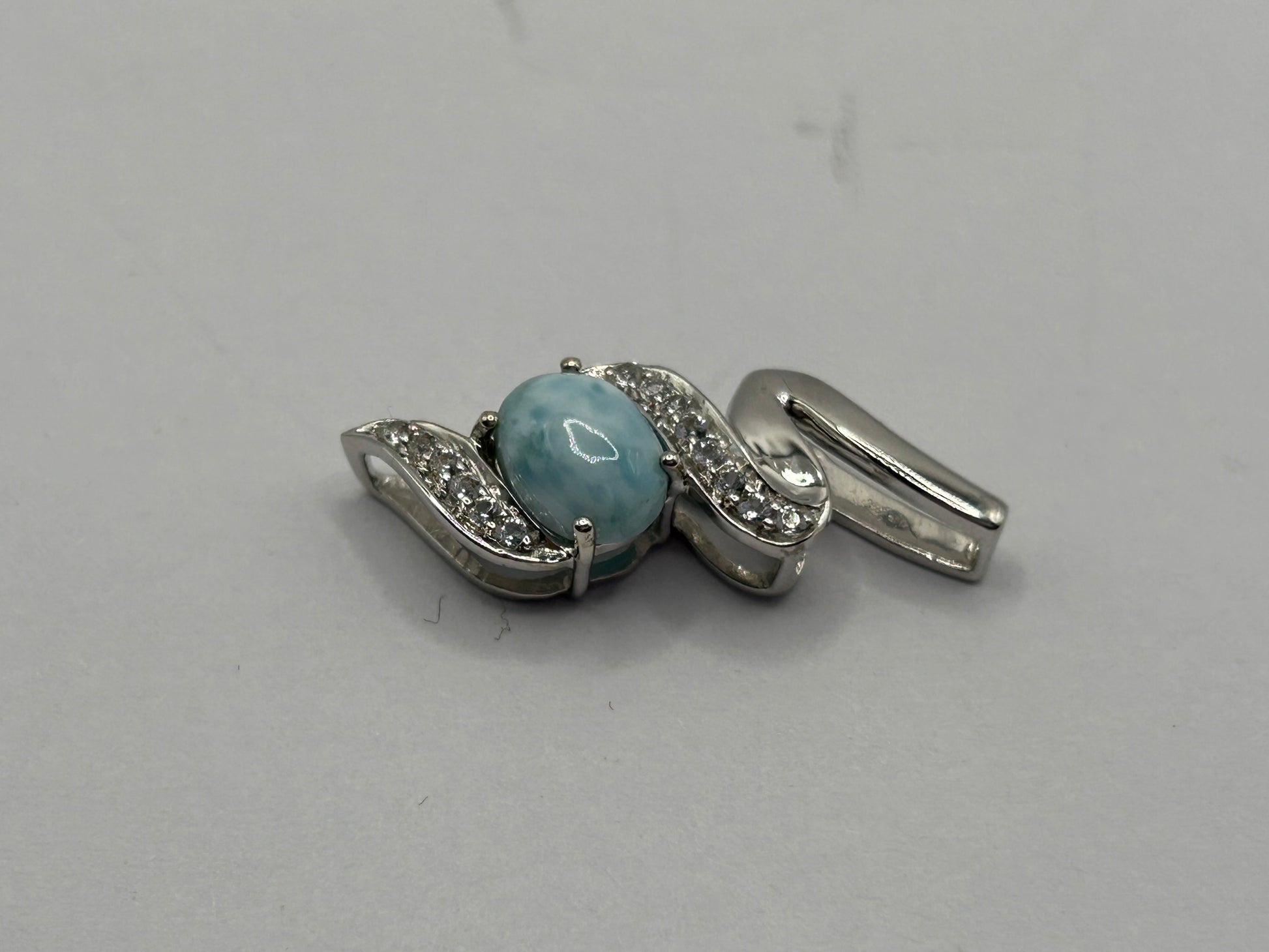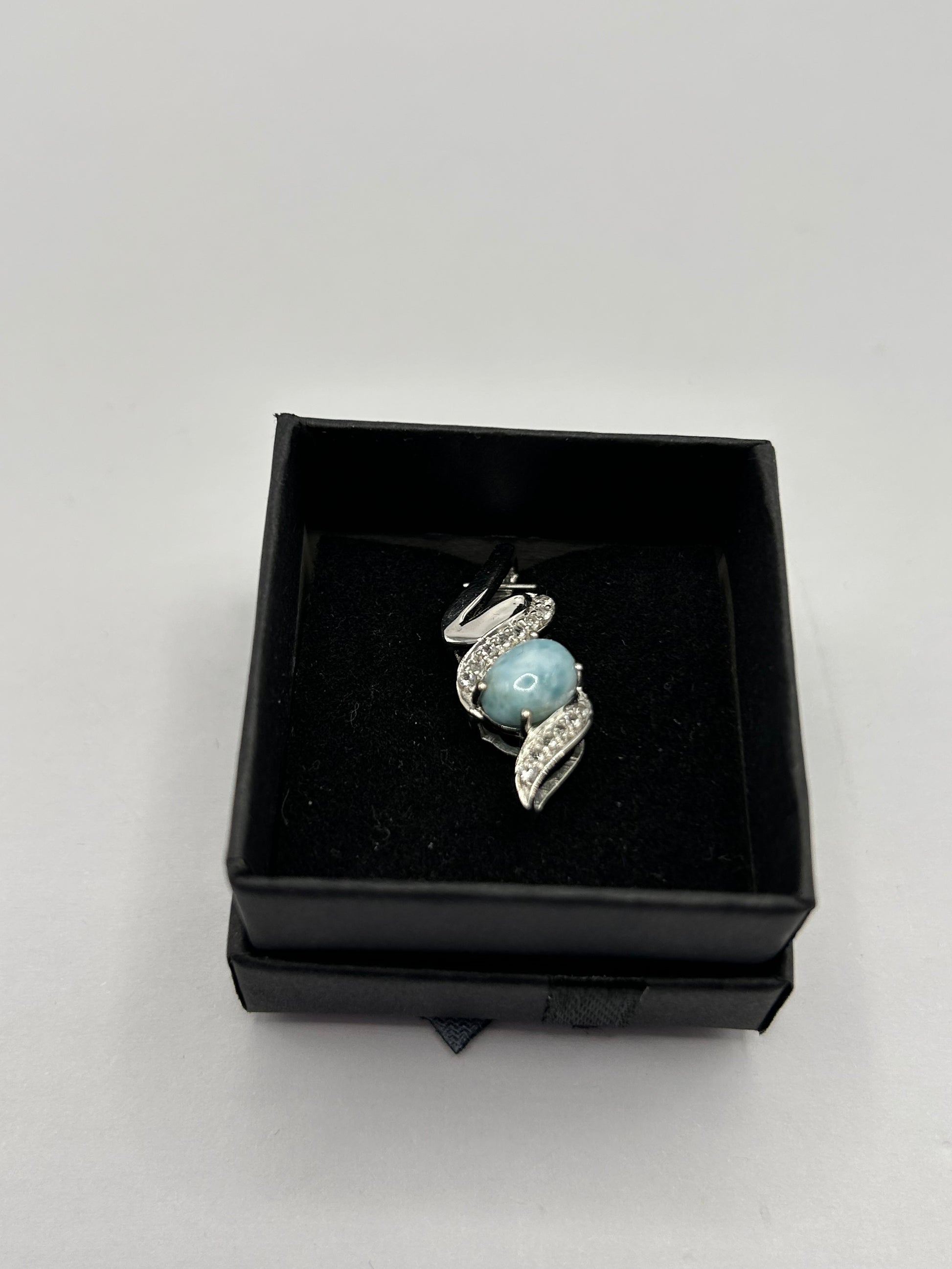 Bring the tranquil beauty of the Caribbean Sea to your neckline with this captivating Larimar and White Topaz pendant, elegantly set in gleaming sterling silver! This unique piece comes complete with its Certificate of Authenticity (COA), guaranteeing its genuine gemstones. The main feature is a beautiful, oval-shaped Larimar gemstone with a smooth cabochon cut, displaying its signature serene blue hues and natural patterns. Delicately accenting the bail are sparkling white topaz stones, adding a touch of brilliance and sophistication. Weighing 2.12 grams, this pendant is lightweight and comfortable for everyday wear. Larimar is a rare and unique gemstone found only in the Dominican Republic, cherished for its calming energy and striking appearance. It makes a perfect statement piece, a thoughtful gift, or a unique addition to any natural gemstone collection. Metal: Sterling Silver Main Gemstone: Natural Larimar (oval cabochon cut, unique blue patterns) Accent Gemstones: White Topaz Weight: 2.12 grams Certification: Includes Certificate of Authenticity (COA) Style: Solitaire Pendant with Accent Stones In excellent condition, a beautiful and authenticated natural treasure!