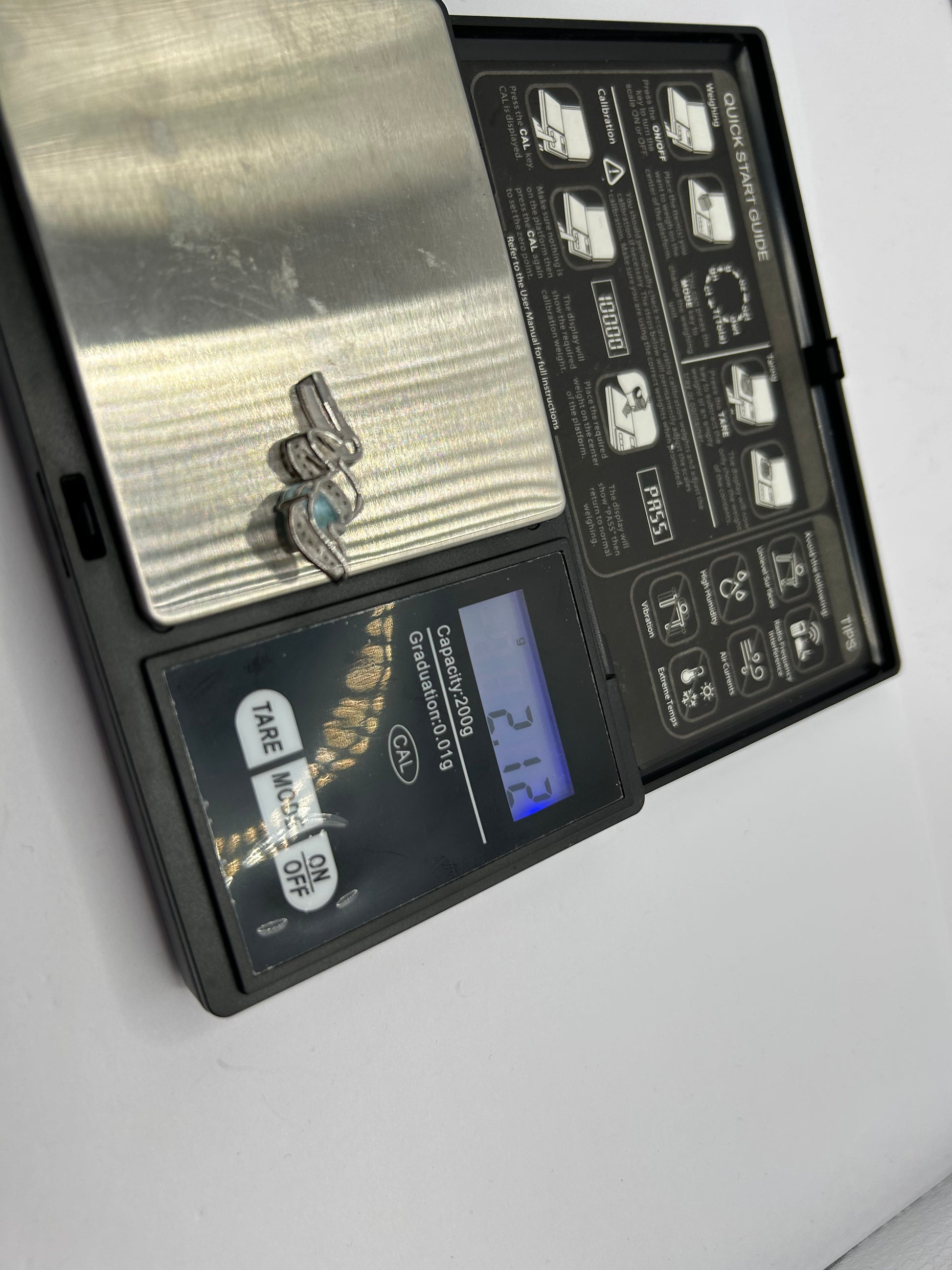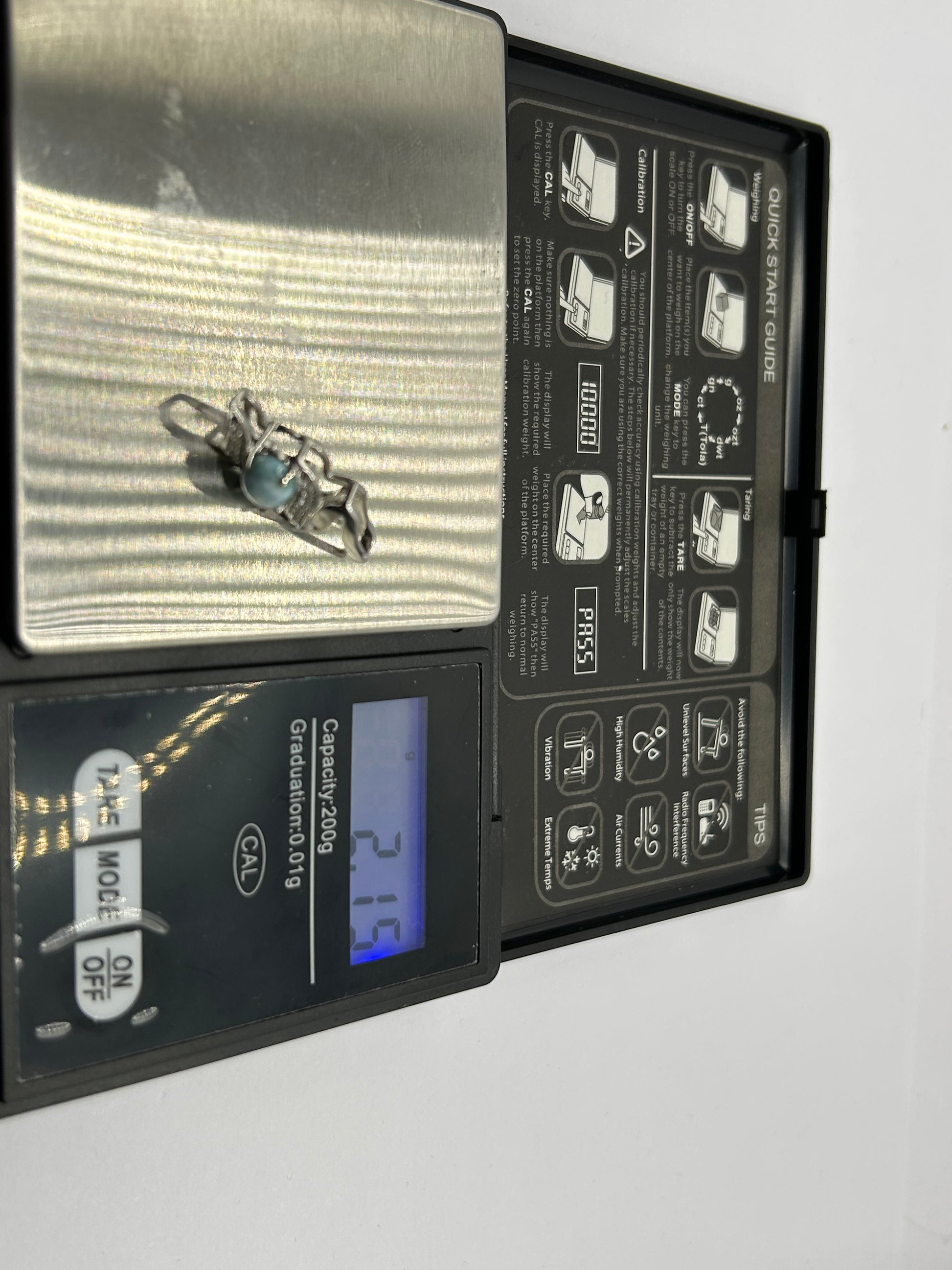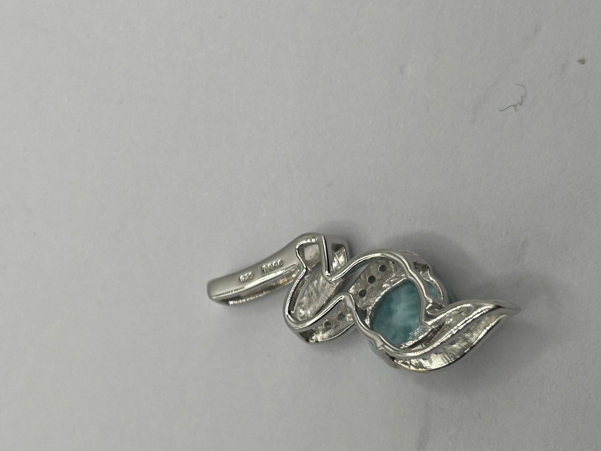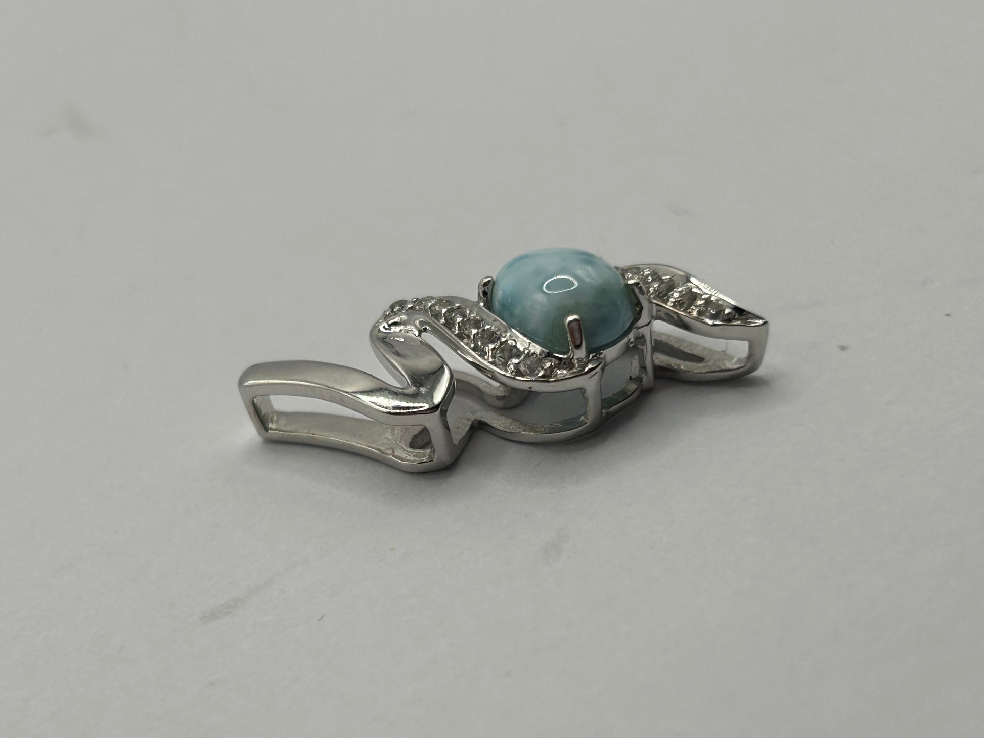 Bring the tranquil beauty of the Caribbean Sea to your neckline with this captivating Larimar and White Topaz pendant, elegantly set in gleaming sterling silver! This unique piece comes complete with its Certificate of Authenticity (COA), guaranteeing its genuine gemstones. The main feature is a beautiful, oval-shaped Larimar gemstone with a smooth cabochon cut, displaying its signature serene blue hues and natural patterns. Delicately accenting the bail are sparkling white topaz stones, adding a touch of brilliance and sophistication. Weighing 2.12 grams, this pendant is lightweight and comfortable for everyday wear. Larimar is a rare and unique gemstone found only in the Dominican Republic, cherished for its calming energy and striking appearance. It makes a perfect statement piece, a thoughtful gift, or a unique addition to any natural gemstone collection. Metal: Sterling Silver Main Gemstone: Natural Larimar (oval cabochon cut, unique blue patterns) Accent Gemstones: White Topaz Weight: 2.12 grams Certification: Includes Certificate of Authenticity (COA) Style: Solitaire Pendant with Accent Stones In excellent condition, a beautiful and authenticated natural treasure!