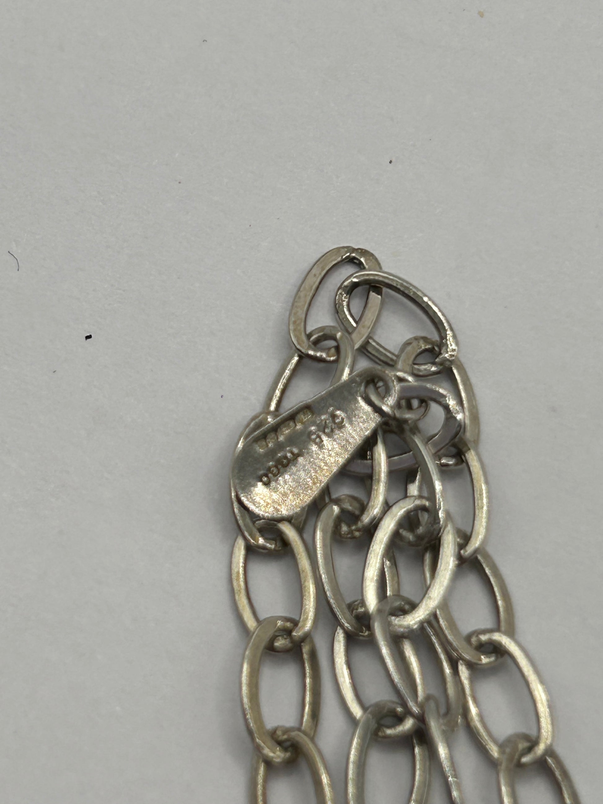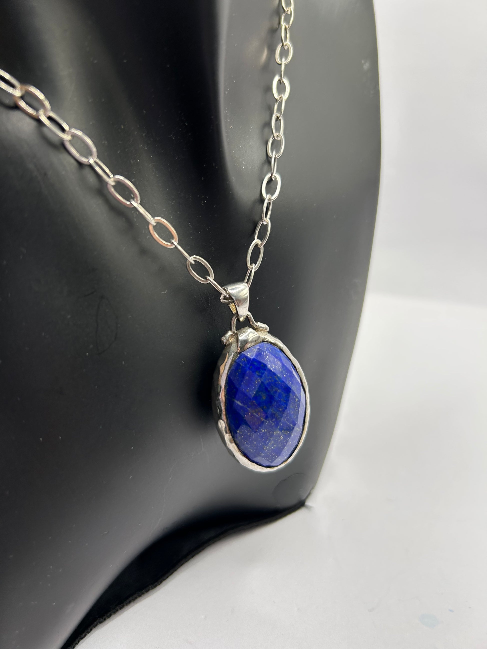 Discover a truly magnificent and versatile treasure with this substantial, reversible pendant and chain set, featuring world-renowned Sar-i-Sang Lapis Lazuli on one side and classic Onyx on the other, all set in gleaming sterling silver! This extraordinary piece comes complete with its Certificate of Authenticity (COA), guaranteeing the genuine quality and origin of these captivating gemstones. The stunning Sar-i-Sang Lapis Lazuli (from Afghanistan's historic mines) displays an incredible deep, royal blue hue with captivating natural pyrite (gold fleck) inclusions, beautifully faceted to catch the light. Flip the pendant, and you reveal a sleek, highly polished black Onyx, also beautifully faceted, offering a bold and classic alternative look. This pendant is securely set in a robust, possibly textured or hammered, sterling silver bezel, suspended from an impressive approx. 31-inch sterling silver chain. Weighing a very substantial 26.07 grams in total, this set has a luxurious feel and makes a powerful statement. Perfect for adapting to any outfit or mood, this reversible pendant offers unparalleled versatility. Lapis Lazuli is the September birthstone, known for wisdom and truth, while Onyx symbolises protection. A truly unique and valuable investment in natural beauty and craftsmanship. Metal: Sterling Silver Gemstones: Natural Sar-i-Sang Lapis Lazuli & Natural Onyx (oval, faceted cuts) Design: Reversible Pendant Chain Length: Approx. 31 inches Total Weight: 26.07 grams (pendant & chain) Certification: Includes Certificate of Authenticity (COA) Style: Statement Pendant Necklace / Versatile Jewellery In excellent condition, a truly unique, authenticated, and substantial treasure!