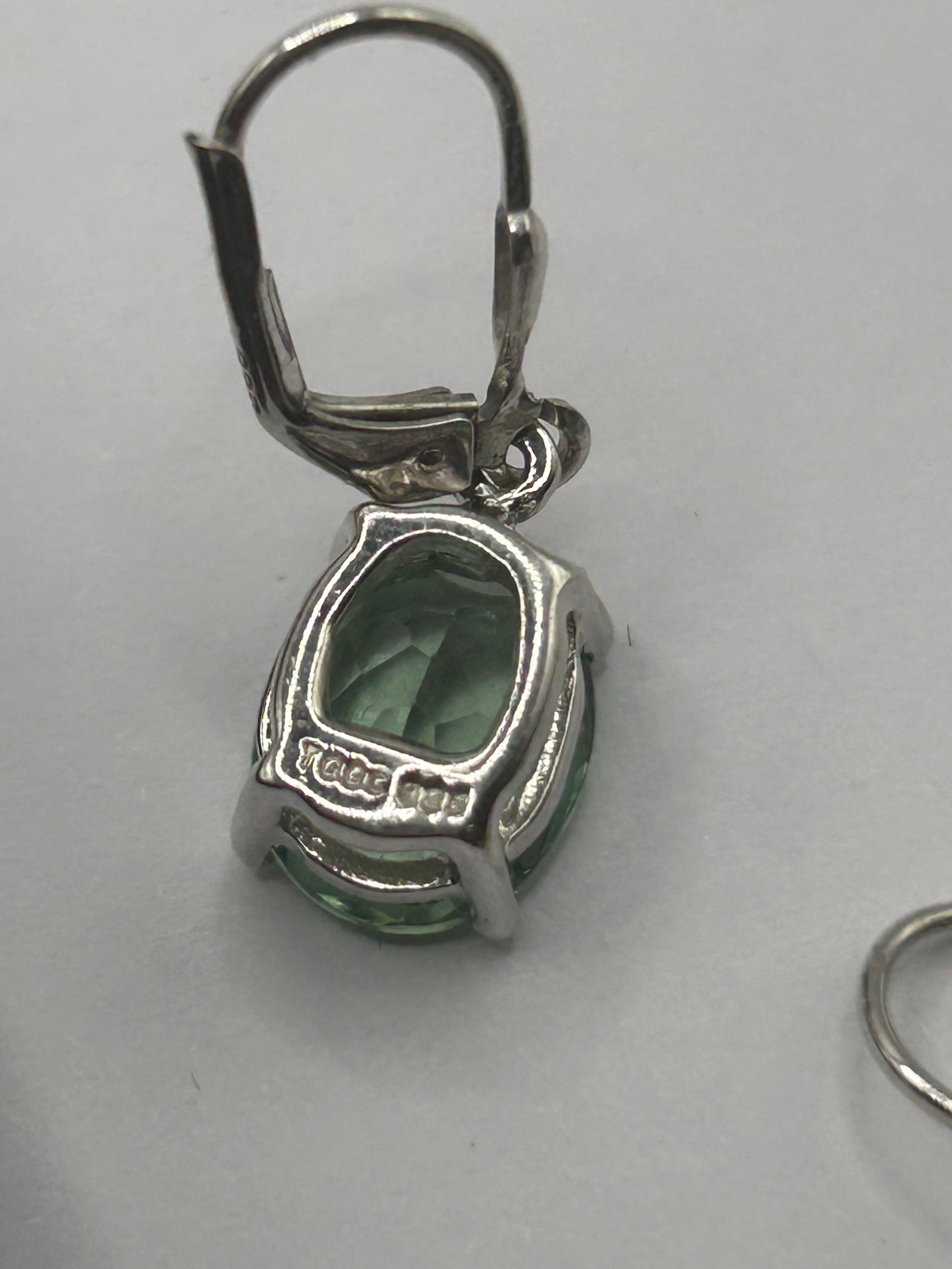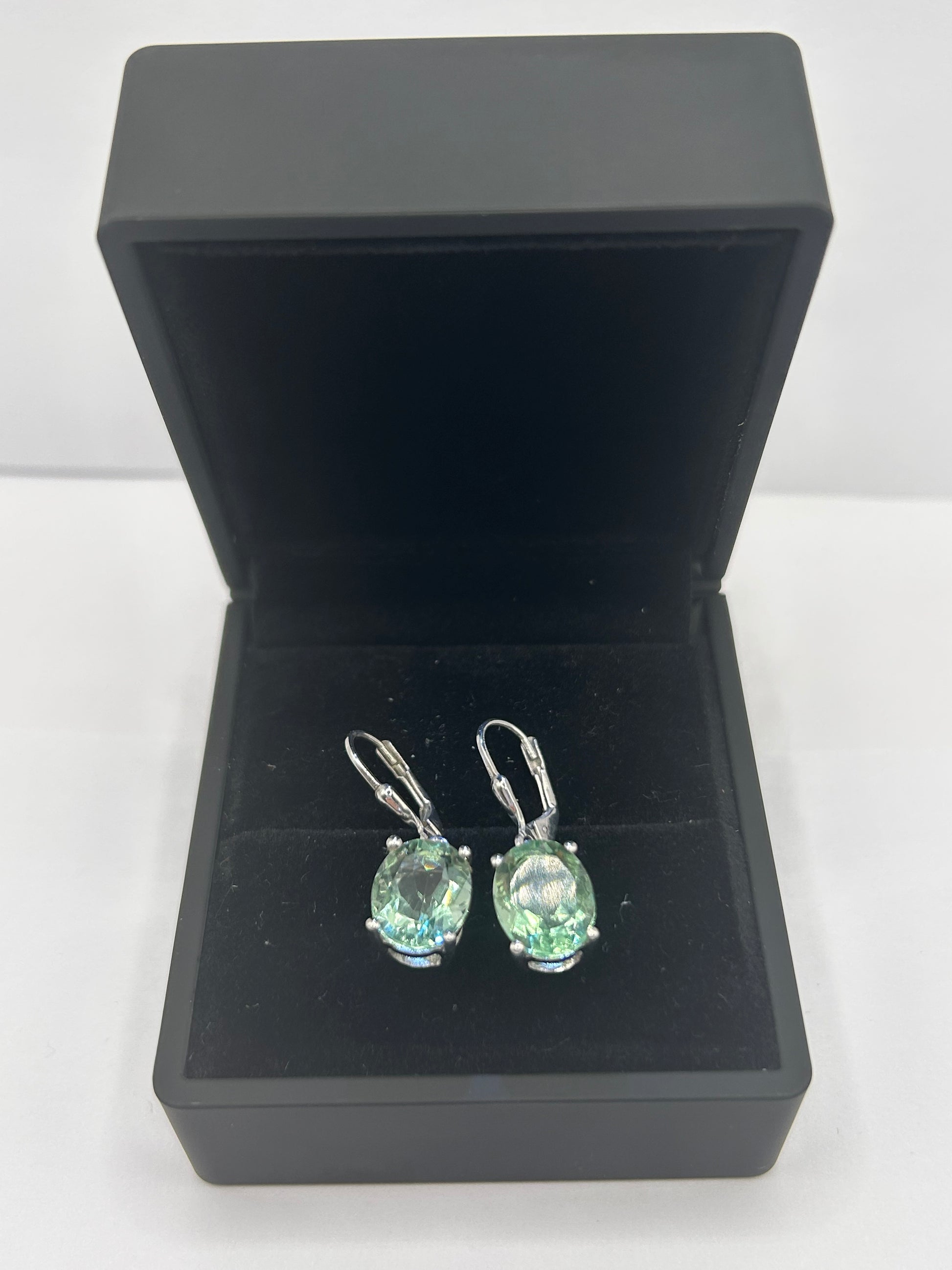 Add a unique splash of natural green to your jewellery collection with these captivating Tucson Green Fluorite earrings, elegantly set in gleaming sterling silver! These beautiful earrings come complete with their Certificate of Authenticity (COA), guaranteeing their genuine gemstones (ref 131). Each earring features a substantial, oval-cut green fluorite gemstone, showcasing a beautiful, translucent green hue that can subtly shift in different lights. With an impressive 8.4 carats total weight, these stones are prominent and make a wonderful statement. They are securely set with classic lever-back findings, ensuring comfort and peace of mind when worn. Fluorite is known as "The Genius Stone," believed to enhance focus and intuition, making these earrings not just beautiful but also meaningful. Perfect for adding unique colour to any outfit or as a thoughtful gift for a gemstone lover. Metal: Sterling Silver 925 Gemstone: Natural Tucson Green Fluorite (oval cut) Carat Weight: 8.4ct Total Weight (TW) Weight: 4.95 grams (total for pair) Certification: Includes Certificate of Authenticity (COA) Style: Drop Earrings with Lever Backs In excellent condition, a beautiful and authenticated natural treasure!