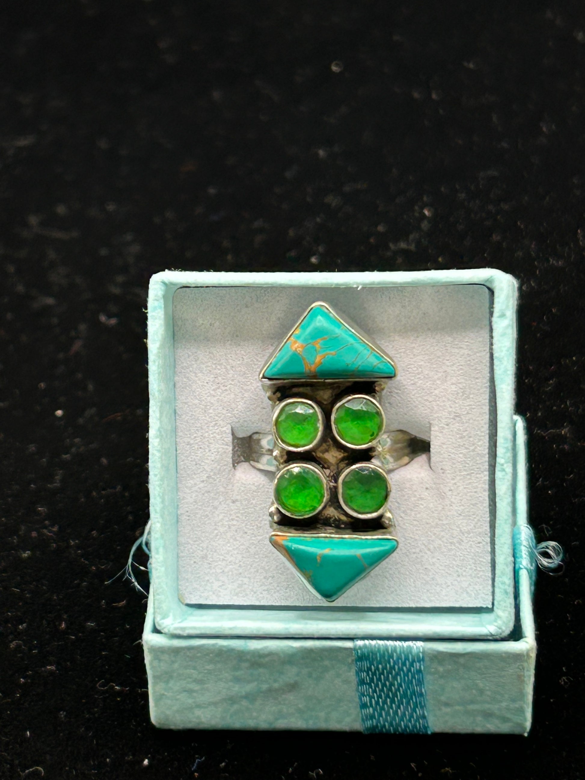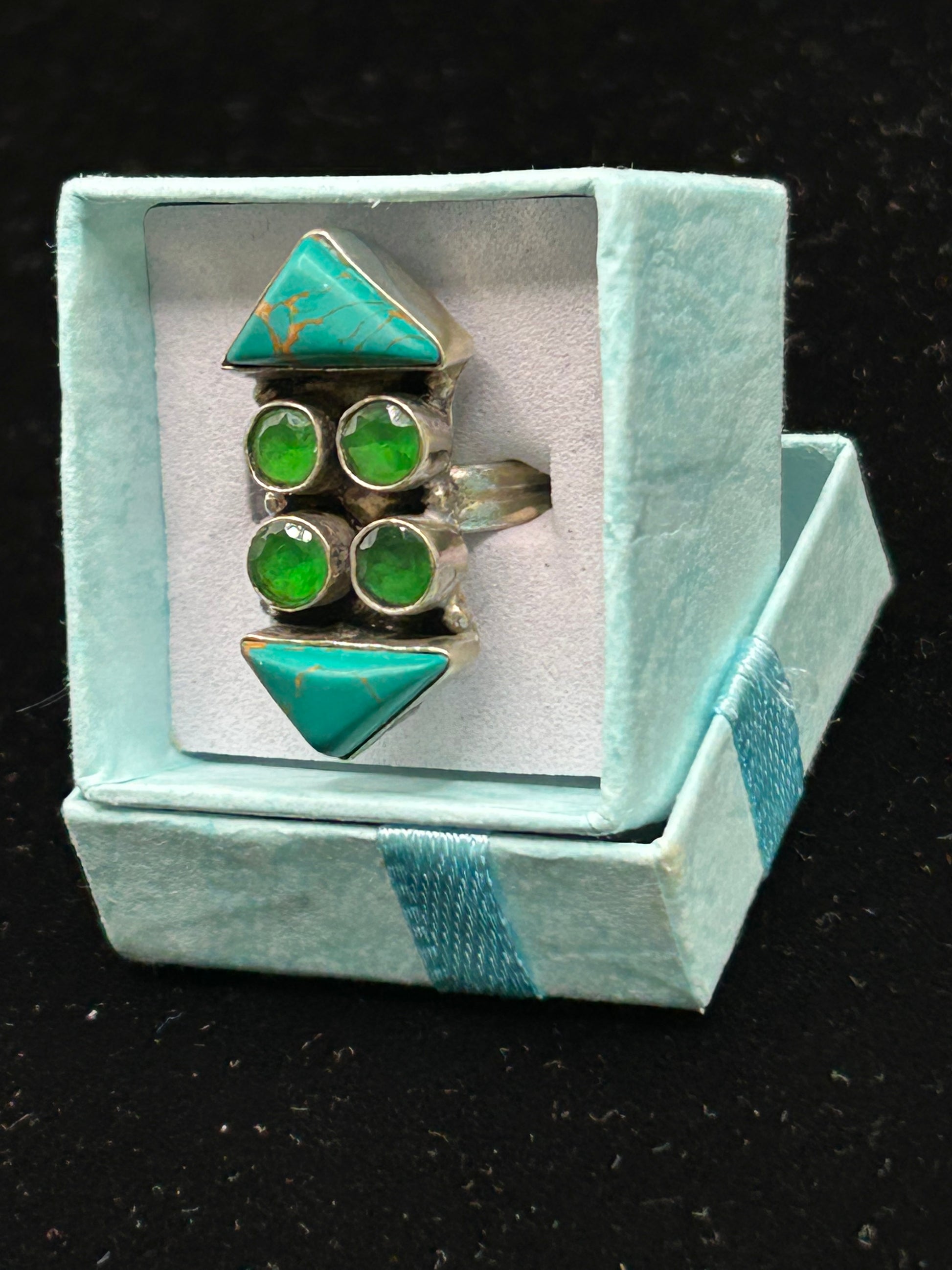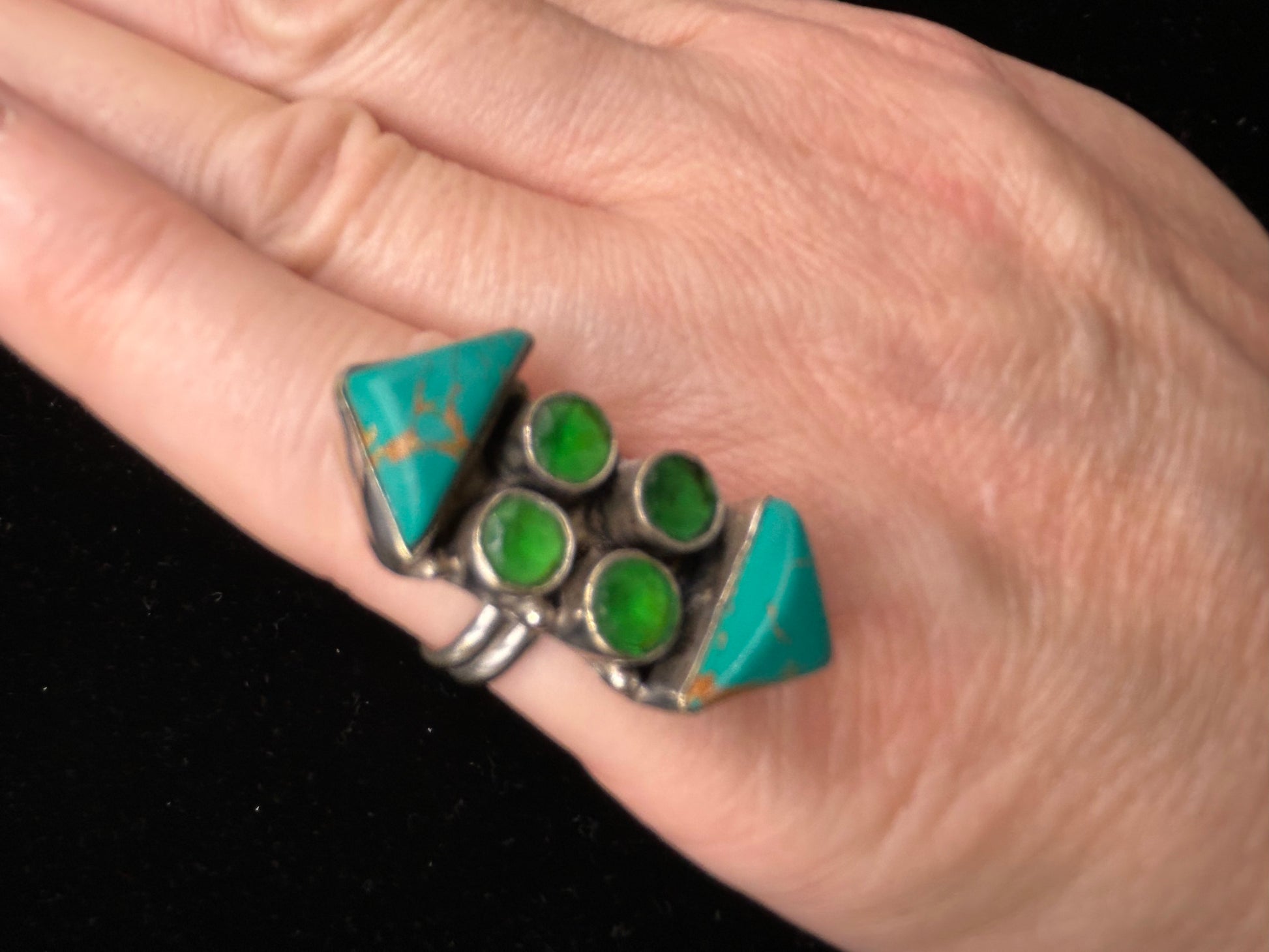 This ring features two beautiful turquoise triangles, each with its own natural matrix, flanking a central row of four vibrant green cabochons. We believe these stones are likely green onyx or chrysoprase, perfectly complementing the rich blue-green of the turquoise.