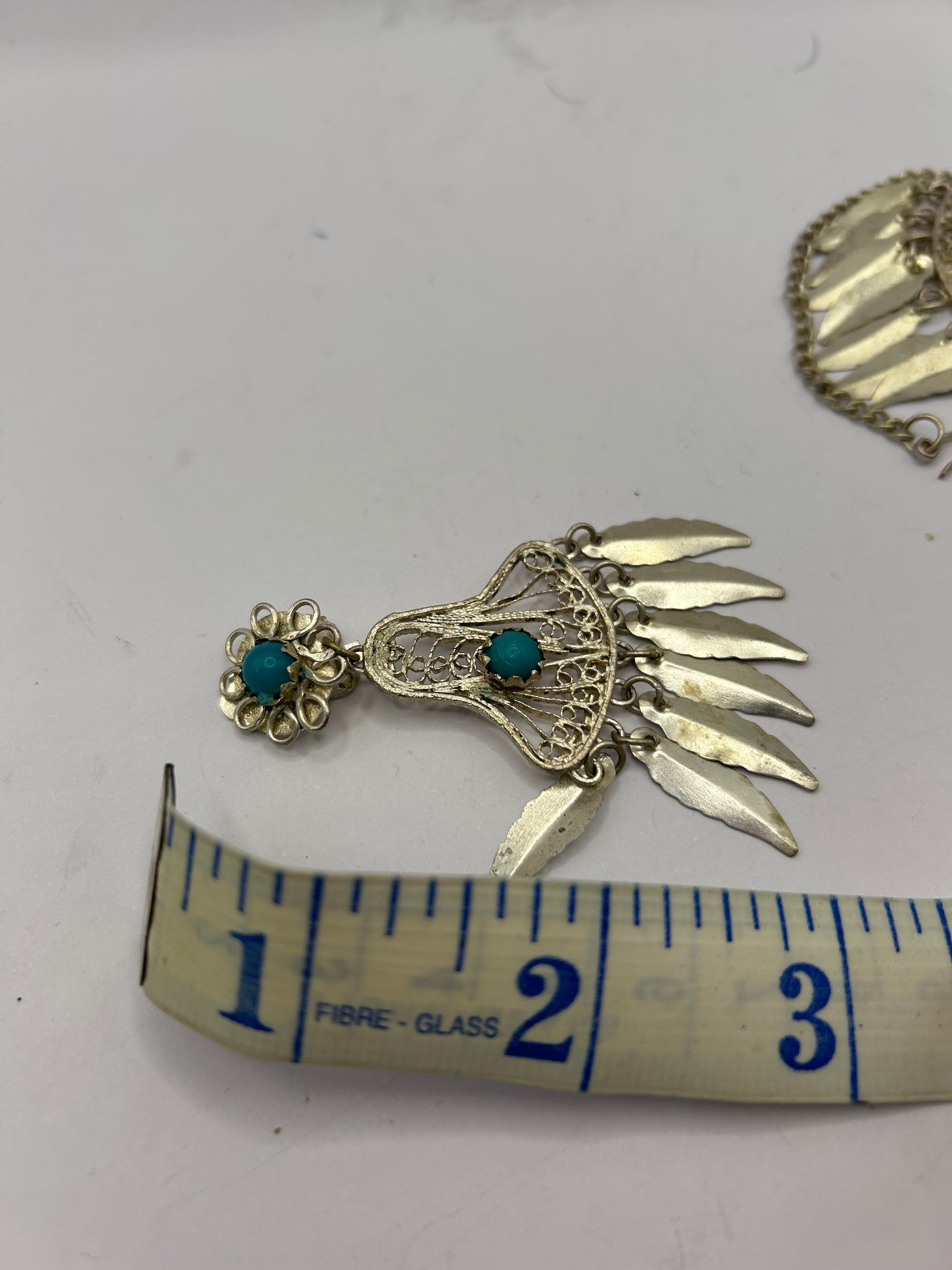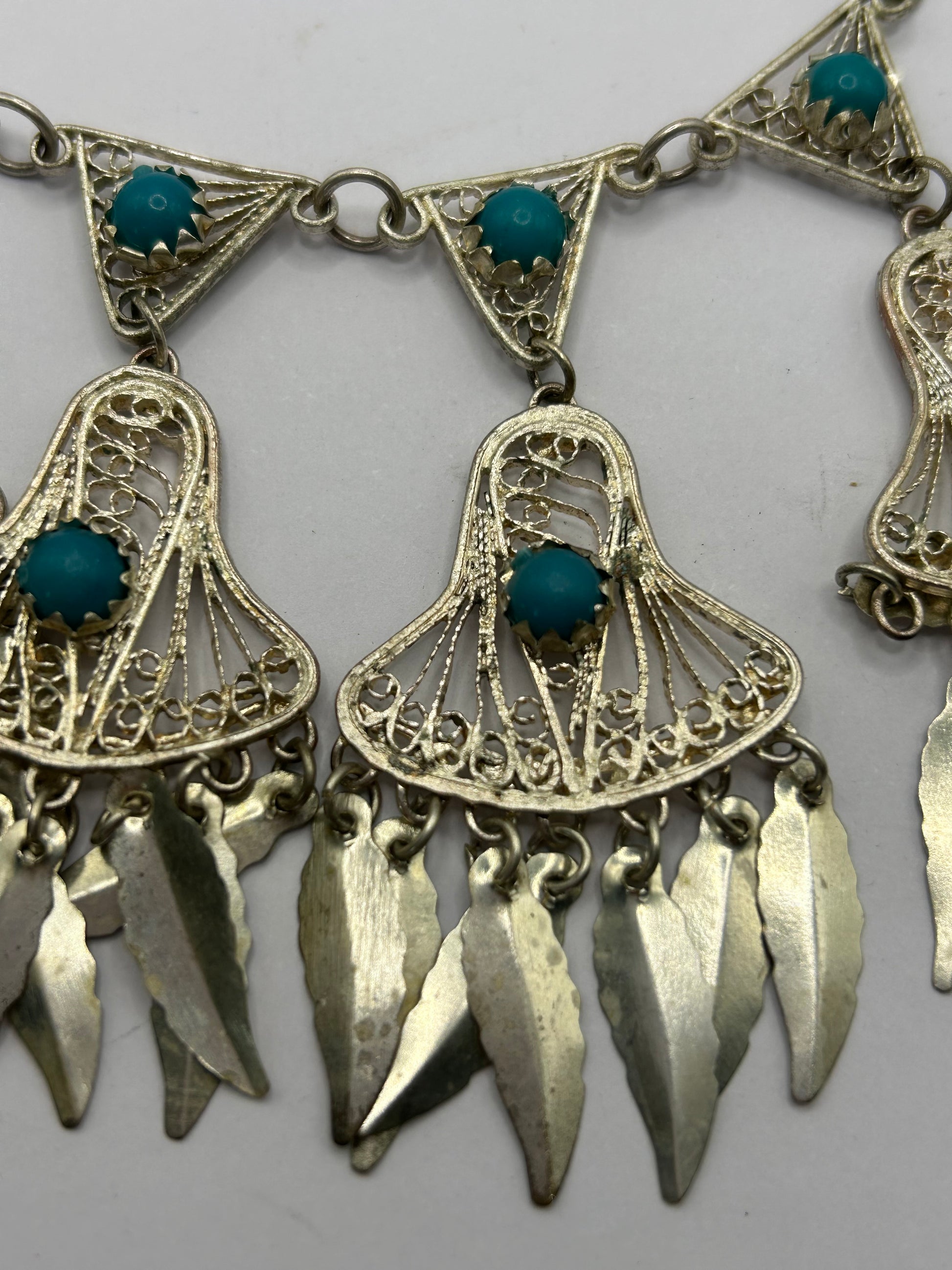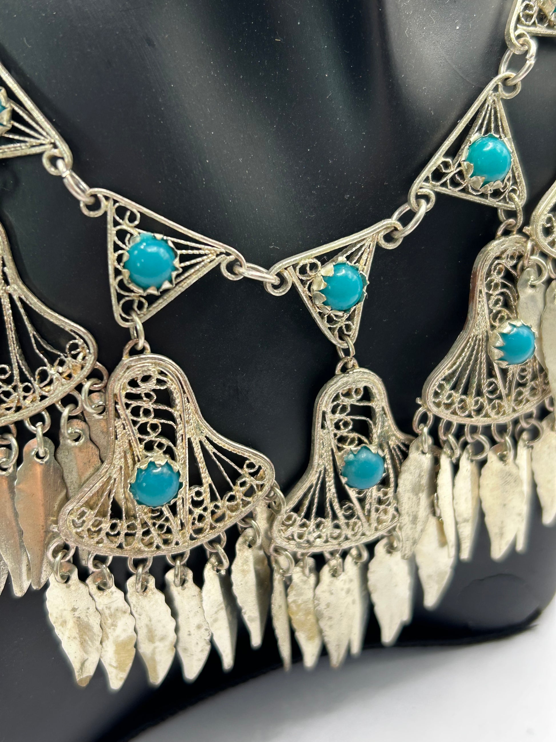 Stunning vintage 925 sterling silver necklace and earring set with turquoise cabochons. This eye-catching set features a unique bohemian/ethnic design with intricate metalwork and beautiful turquoise stones. The necklace and earrings have a combined weight of 50 grams, giving them a substantial feel and high-quality look. A truly special piece for any jewellery lover!" 925 Sterling Silver Hallmarked Turquoise Cabochon's 50-gram weight.