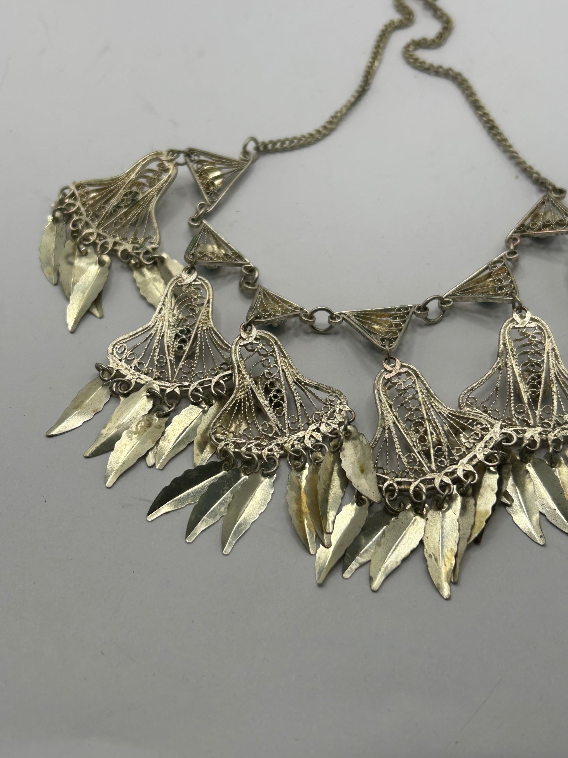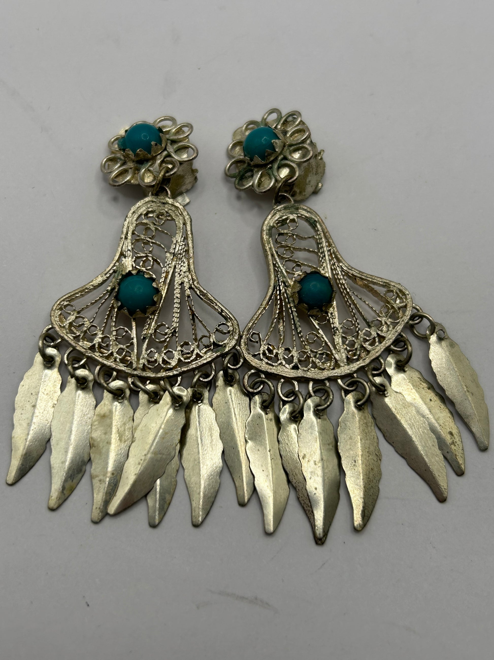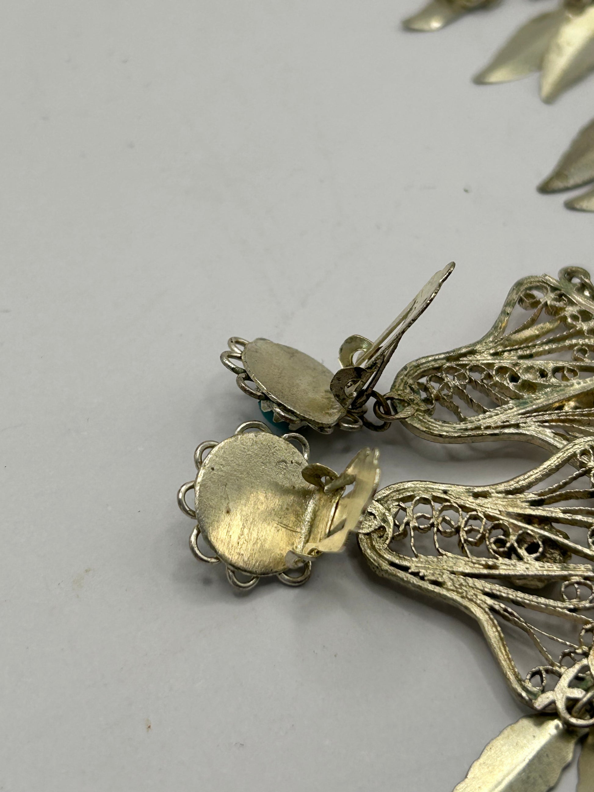 Stunning vintage 925 sterling silver necklace and earring set with turquoise cabochons. This eye-catching set features a unique bohemian/ethnic design with intricate metalwork and beautiful turquoise stones. The necklace and earrings have a combined weight of 50 grams, giving them a substantial feel and high-quality look. A truly special piece for any jewellery lover!" 925 Sterling Silver Hallmarked Turquoise Cabochon's 50-gram weight.