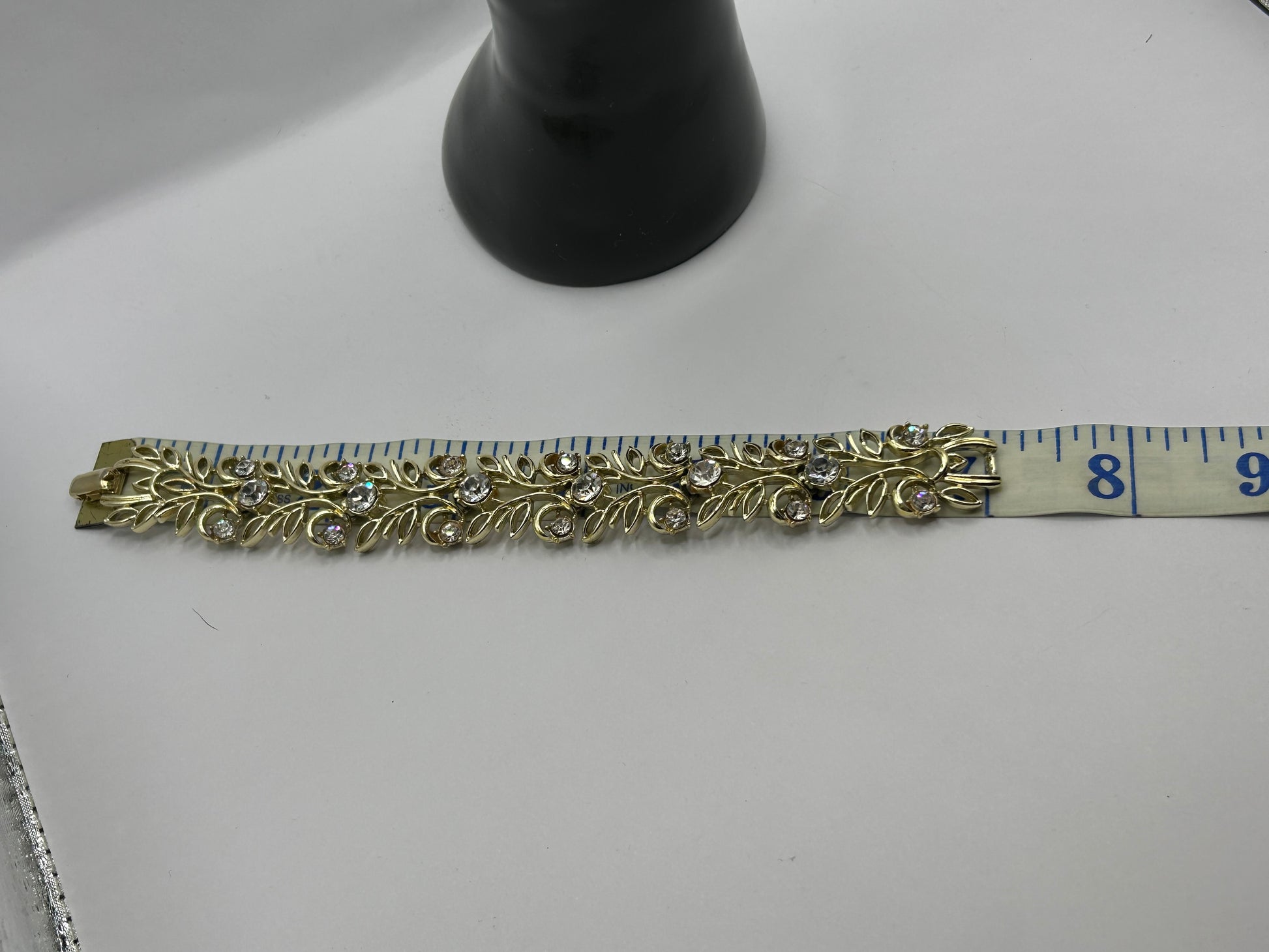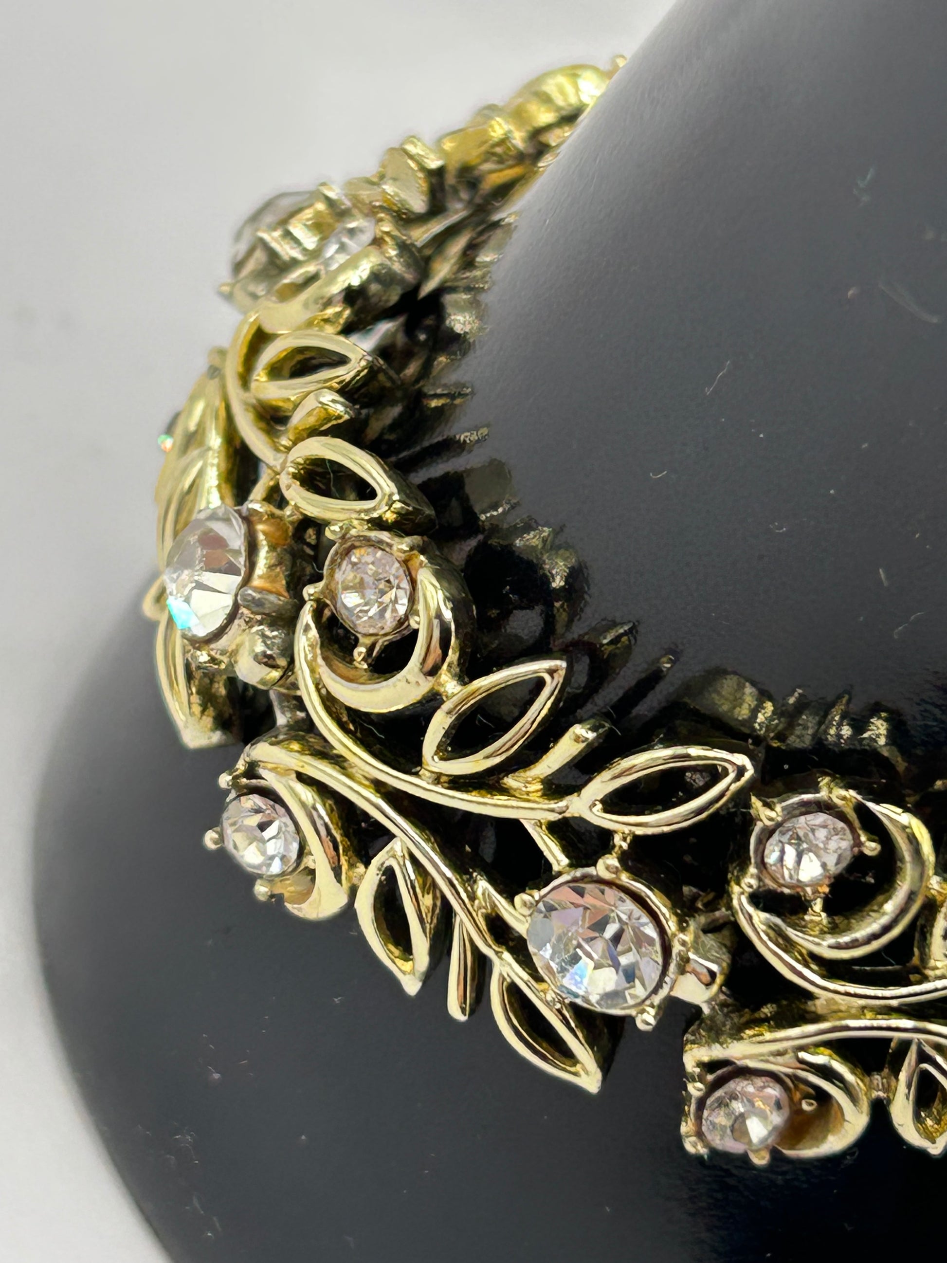 Stunning vintage statement bracelet by JEWELCRAFT! Ornate gold-tone design with leaves and sparkly clear & champagne coloured rhinestones. Great quality and has a nice weight (34g). Signed Jewelcraft on clasp. Approx. 7 inches long. Clasp: Fold over Clasp Perfect for a touch of vintage glamour! Good used vintage condition, some light age-related wear possible but all stones look present. See photos! P1/3