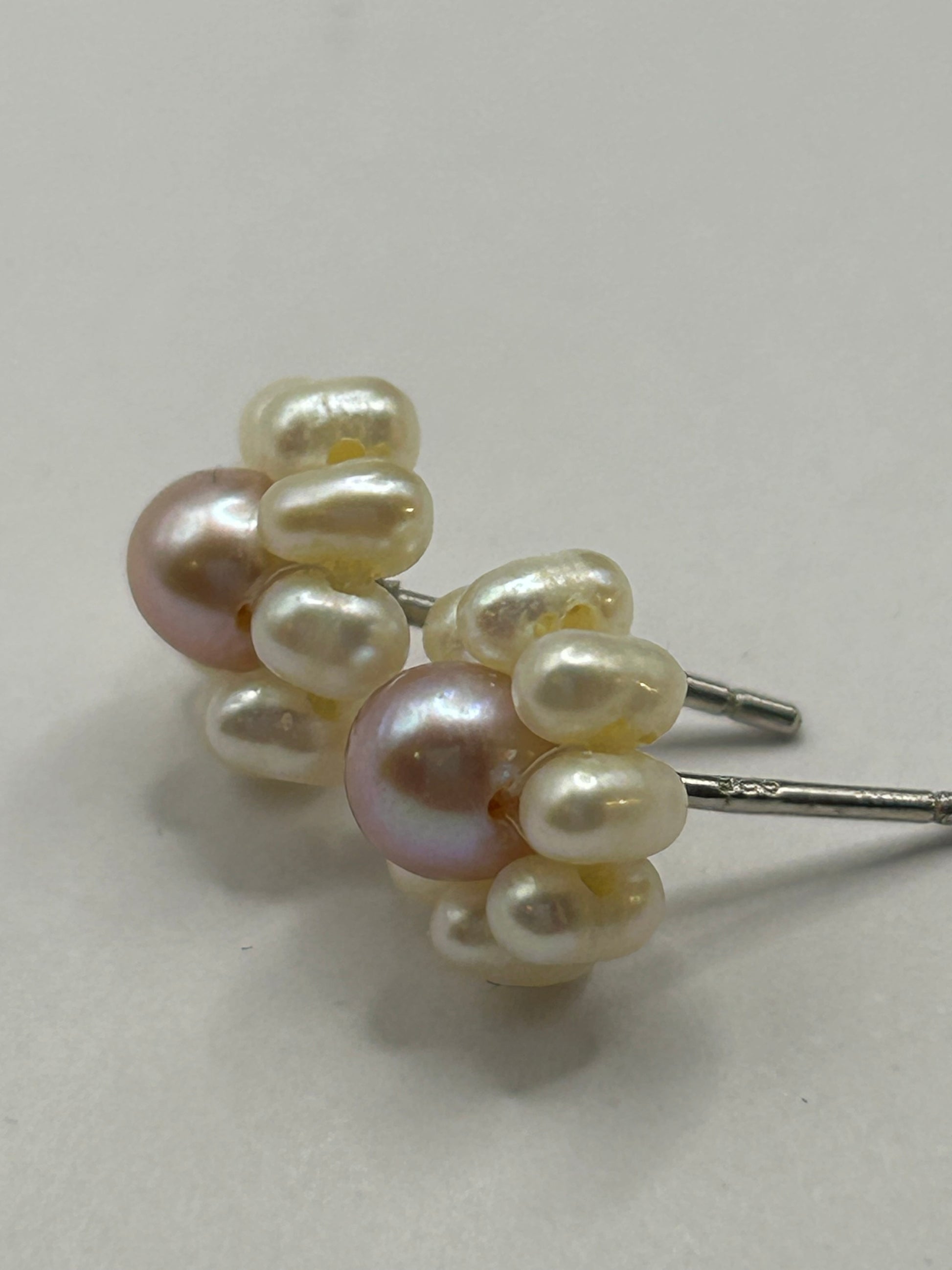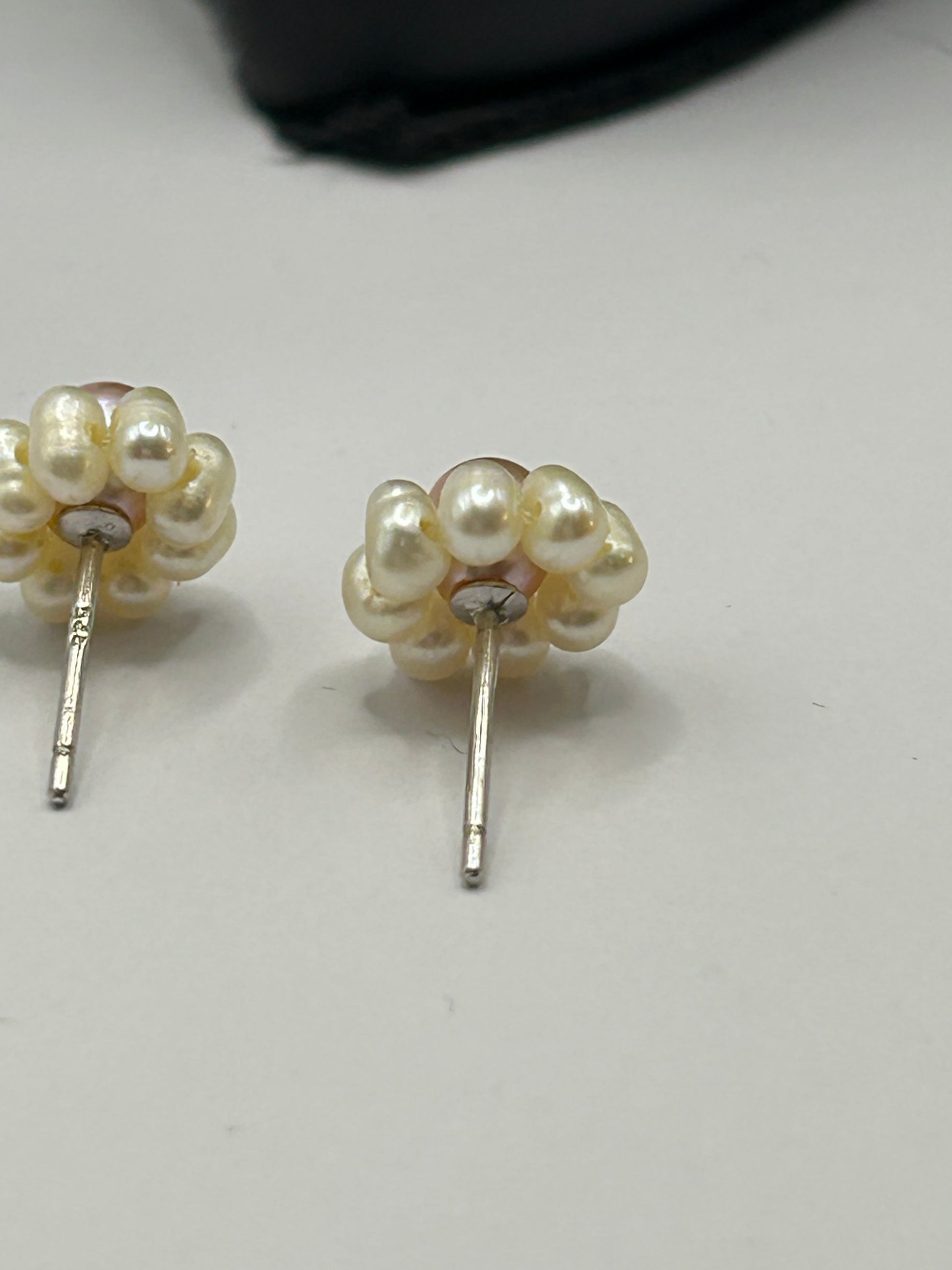 Pretty vintage floral / daisy design stud earrings. Made from Sterling Silver (posts are marked 925, settings also appear silver). Features a central pinkish-peach pearl surrounded by smaller cream/white pearls. These feel like cultured freshwater pearls or good quality simulated pearls (gritty on the tooth test, definitely not cheap plastic!). Approx. 5mm Good used vintage condition. Butterfly backs included . Classic and delicate earrings, perfect for any occasion!